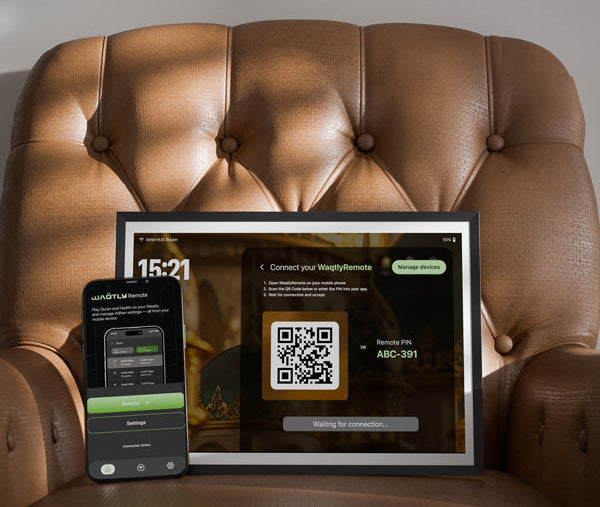 Control your tablet, play Surahs, set reminders, and adjust settings — all from your phone, wherever you are.